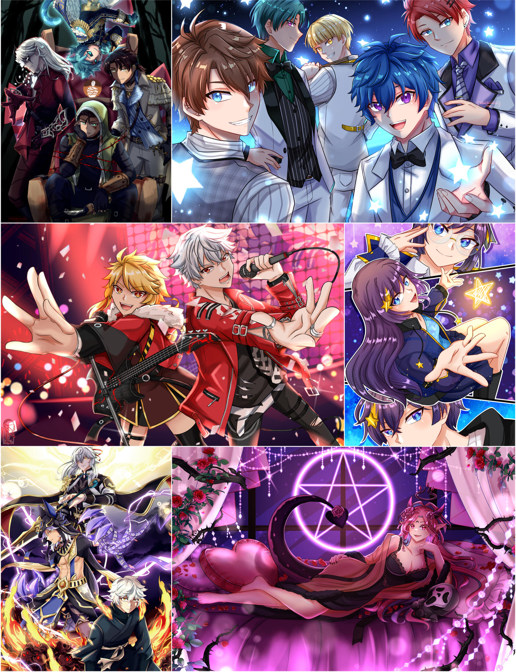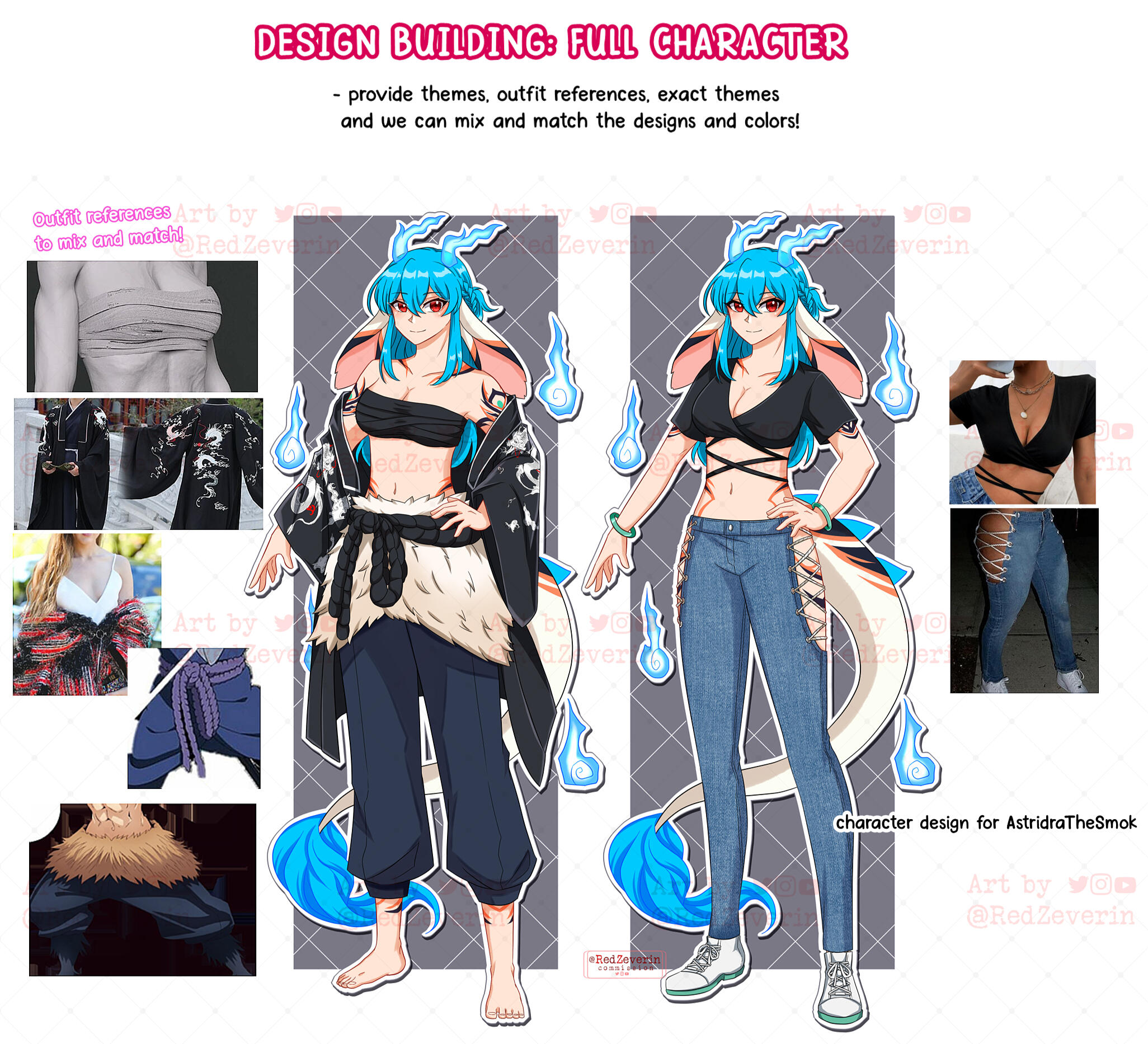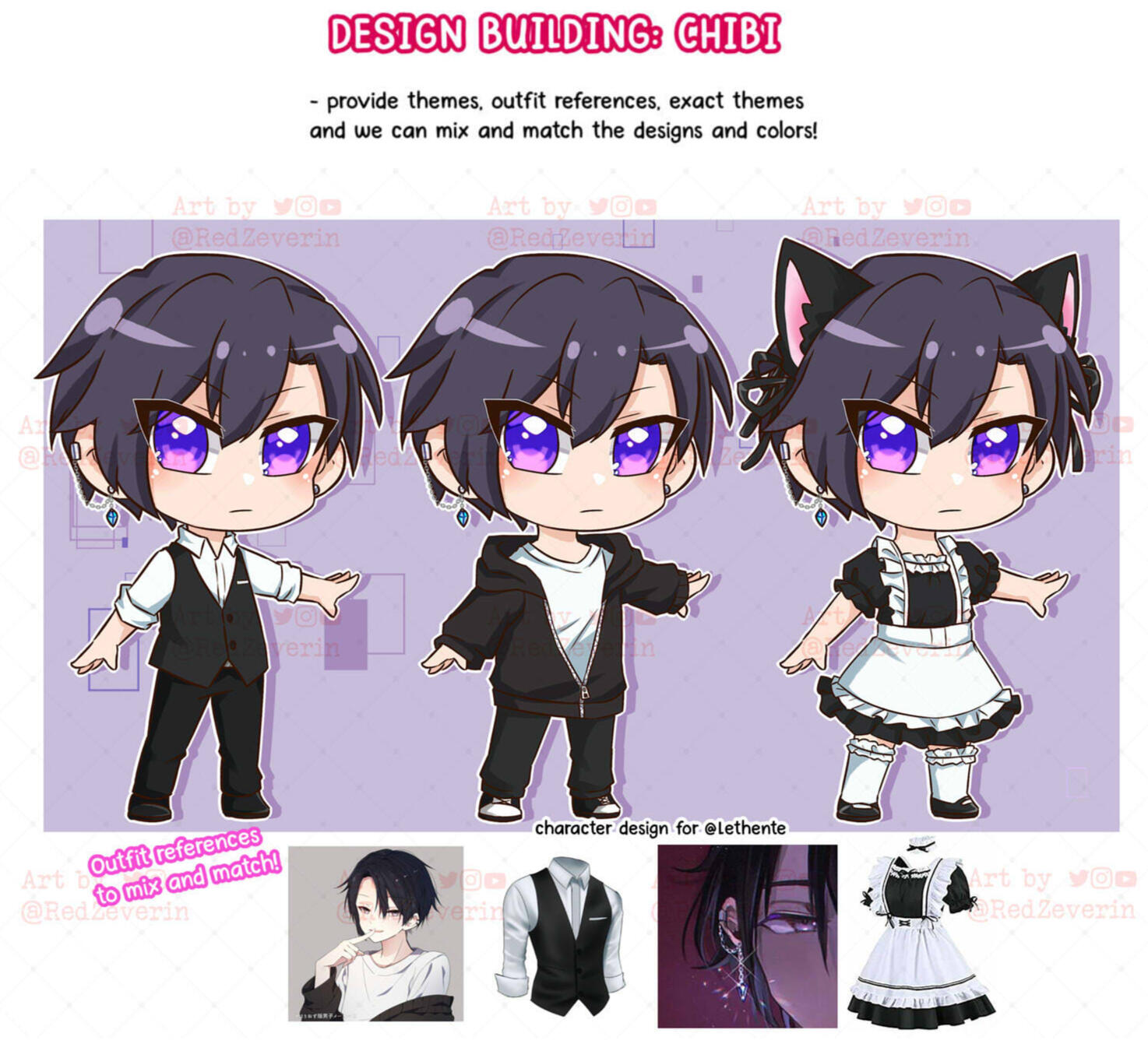 Provide themes, outfit references, exact themes and we can mix and match the designs and colors!Base price : $50 for 2 designs.+ $10 : one more design OR combining the two designs