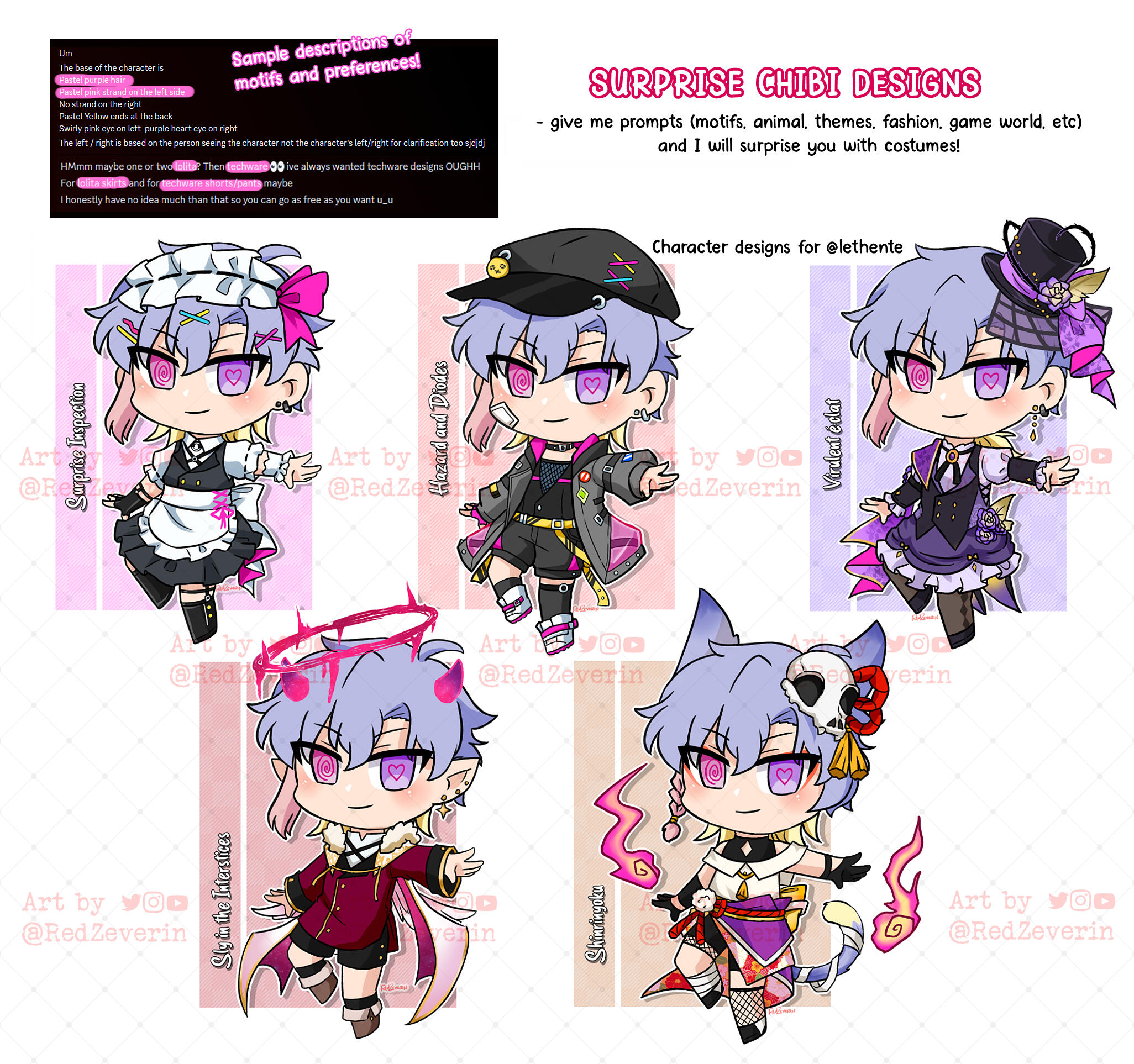 Give me prompts (motifs, animal, themes, fashion, game world, etc) and I will surprise you with chibi character costumes!Base price : $60 for 2 designs with one additional color variation per design.+ $15 : add one more design