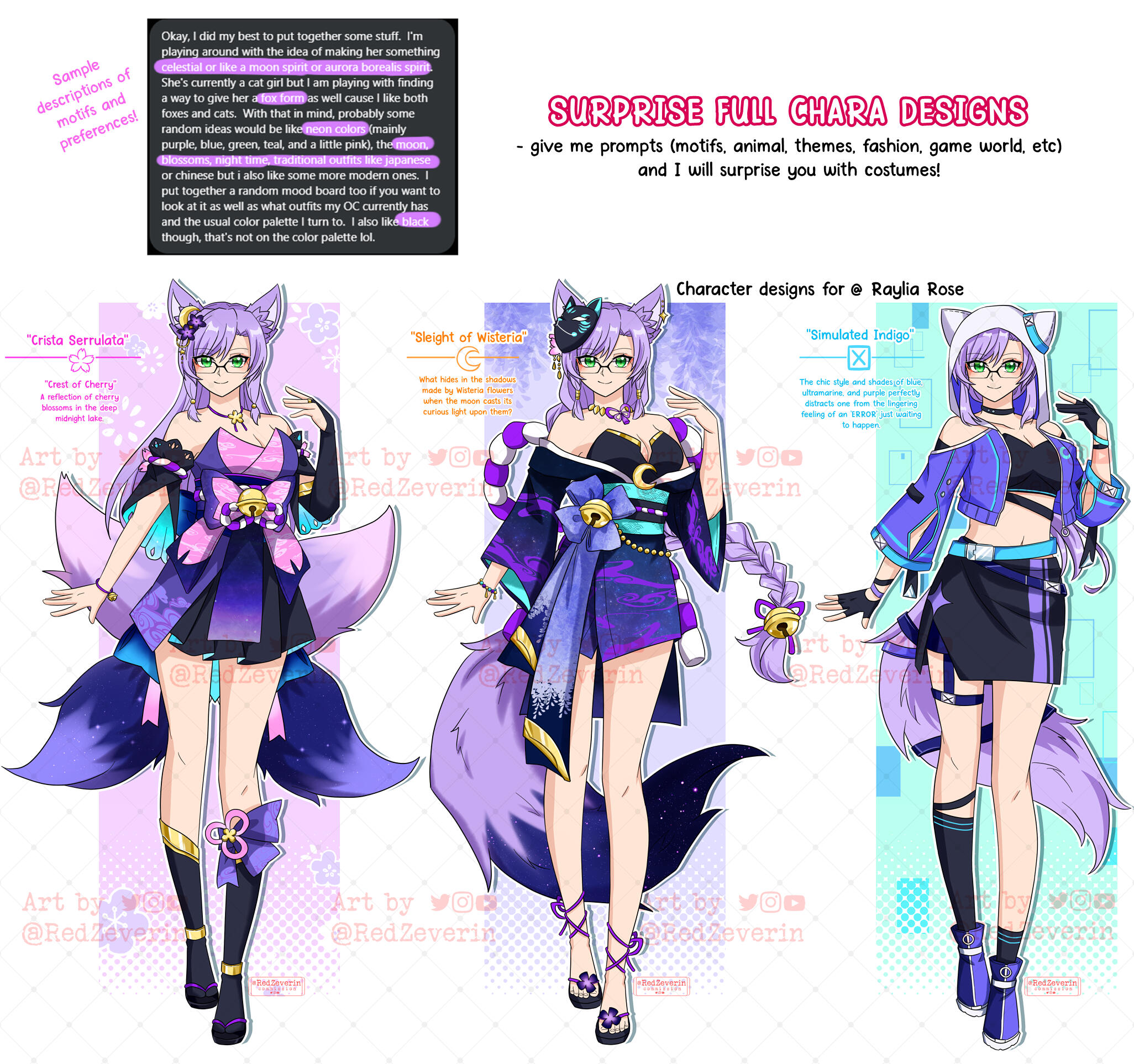Give me prompts (motifs, animal, themes, fashion, game world, etc) and I will surprise you with full body character costumes!Base price : $90 for 2 designs. Includes outfit name and a short description for inspirations and motif.+ $30 : one more design